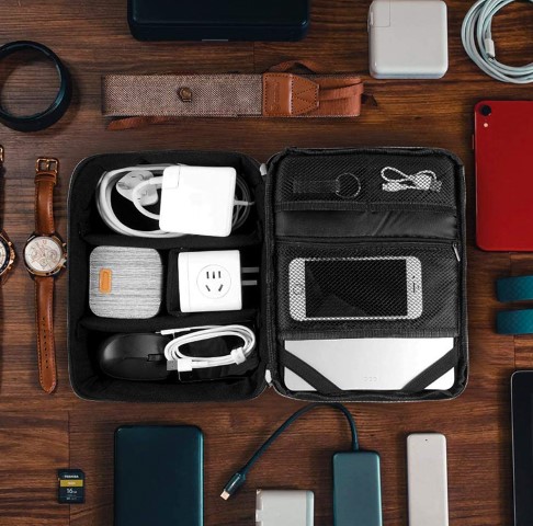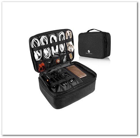 First layer – Large capacity for cables and chargers. 11 elastic loops to hold various items like charging cables, cellphone, pens, and etc; 5 access mesh pockets to pack various small gadgets of USB drives, SD/TF Cards, flash drives;